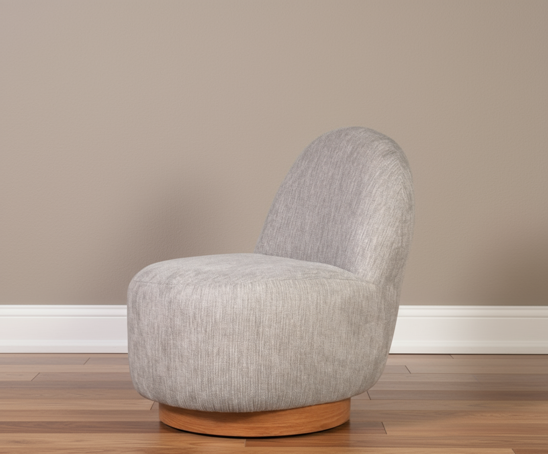 A modern, sculptural swivel lounge chair with a minimalist silhouette and cozy design. Upholstered in a soft heathered grey fabric, this armless chair features rounded edges and a low-profile backrest that curves seamlessly into the seat. Its understated aesthetic and compact footprint make it ideal for modern, minimalist, or Scandinavian-style interiors, perfect for reading nooks, bedrooms, or living rooms.