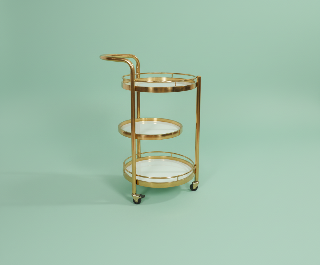 Wheels: The cart is supported by four swiveling casters in a matching brass finish, making it easy to move.