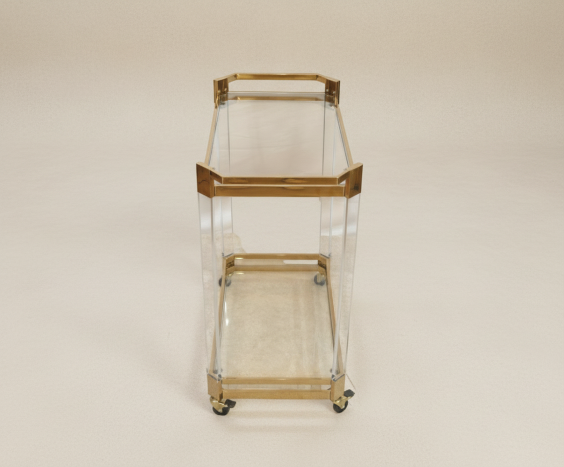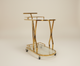 Handles: A simple, curved handle extends from the top shelf's frame, made of a matching brushed brass.