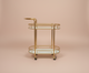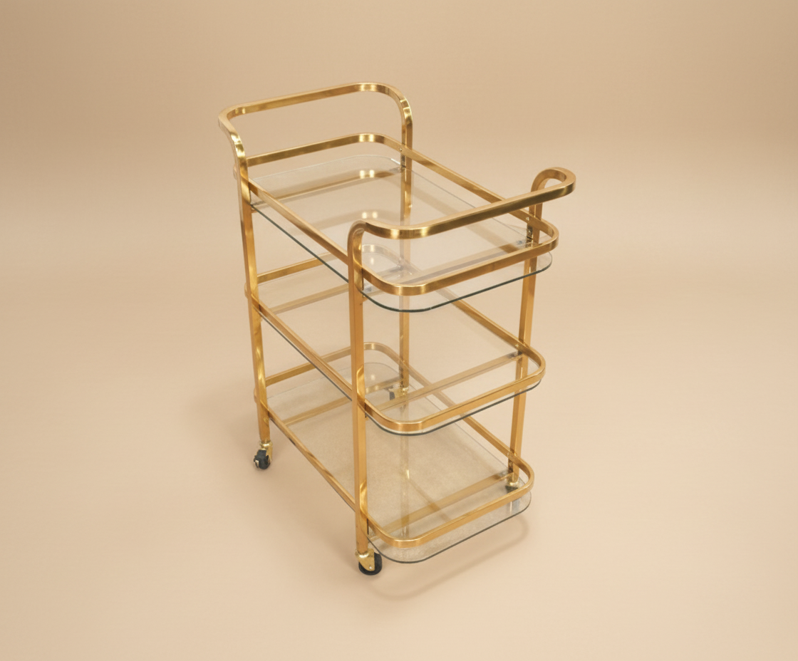 Handles: A simple, curved handle extends from the top shelf's frame, made of a matching brushed brass.