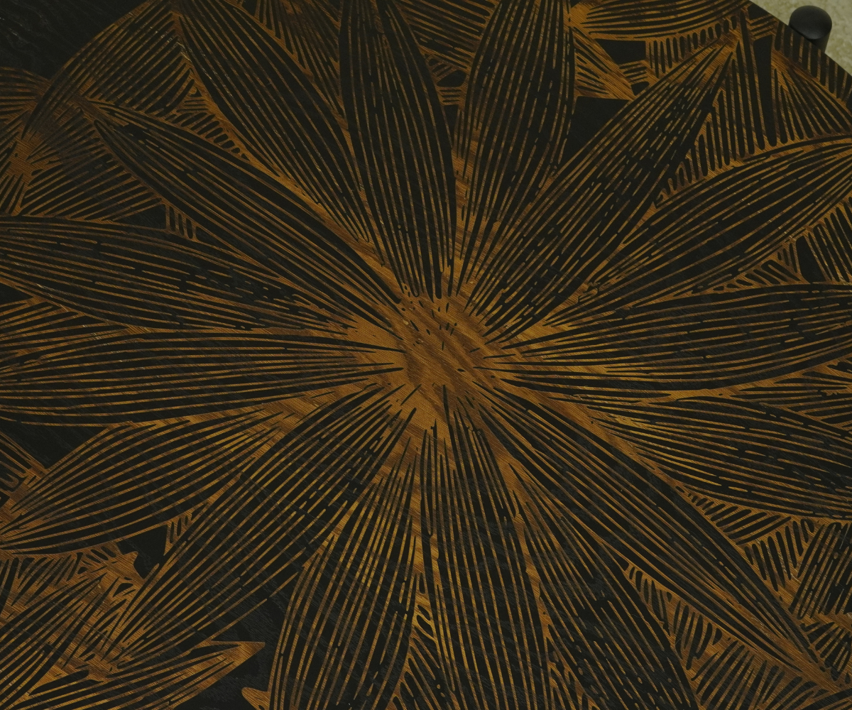 Finish/Color: Dark brown or black base with a contrasting gold or amber-colored radiating design. The design resembles stylized leaves, flowers, or starbursts emanating from the center.