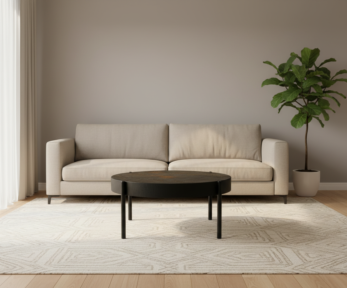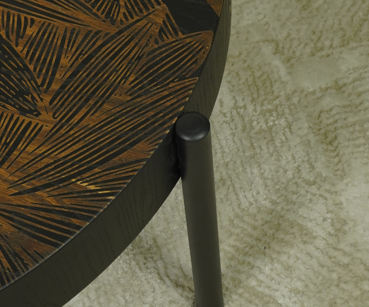 A single, round, low-profile coffee table with a striking, decorative top. The table features a drum-style body in a dark, textured finish, complemented by a unique, radially patterned wood veneer top and supported by four simple, cylindrical black legs.